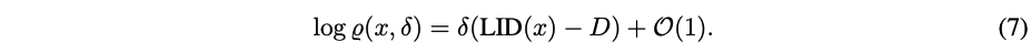 만약 다양한 $\delta$ 값에 대해서 $\text{log} \varrho(x,\delta)$를 evaluate할 수 있다면, $LID(x)$를 추정하는데 avenue를 제공할 것이다. $\delta_1, \cdots, \delta_m$의 값을 셋팅하고, $\{ (\delta_i, \text{log} \varrho(x,\delta_i)) \}^m_{i=1}$로 linear regression을 fitting한다. 이 regression의 slope를 $\hat{\beta}_x$라고 하면, 이는 $LID(x) - D$를 추정하고, 그래서 $LID(x) \approx D + \hat{\beta}_x$가 local intrinsic dimension에 대한 sensible estimator가 된다.
