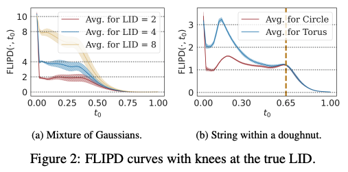 본 논문은 model-based estimator인 LIDL을 기반으로, 하나의 pre-trained diffusion model(DM)만을 사용해서 LID가 어떻게 효율적으로 추정되는지를 보여줌으로써 이러한 문제들을 해결한다. LIDL data에 다른 수준의 Gaussian noise를 곱하고, 각 수준에 대해서 normalizing flow를 학습시키고, noise의 log standard deviation를 covariate으로 하고 이에 대응하는 response로 $x$에서 평가된 log density를 사용해서 linear regression을 fitting하는 것으로 계산된다. 이를 통해 얻어진 slope는 $\text{LID}(x) - D$의 추정치가 된다. 본 논문에서는 먼저 많은 normalizing flow보다 하나의 DM만이 필요한 방식으로 어떻게 LIDL을 DM에 적용할지 보여준다. 이를 직접 적용하는 것은 하나의 DM만 필요로 하지만 여러번의 ODE solver의 호출을 필요로 한다. 본 논문은 한번의 solve로 모든 필요로 되는 log density를 계산하는 대안의 ODE로 이를 어떻게 우회할지 보인다. 그런 다음 본 논문은 LIDL에서 regression의 slope이 diffusion process에서 marginal log probability의 변화 비율을 포착하는 것을 목표로 한다는 것을 논의한다. 이러한 결과로 나온 estimator FLIPD는 매우 효율적이고 ODE solver에 대한 필요를 우회한다.
