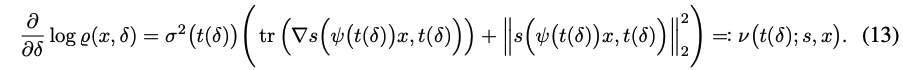 $\delta_1$에서 $\delta_m$로 이 ODE를 푸는 것은 trajectory $(\text{log}\hat{\varrho}(x,\delta))_{\delta \in [\delta_1, \delta_m]}$를 생성한다. $v(t(\delta);\hat{s},x)$가 $\hat{\varrho}(x, \delta)$에 의존하지 않기 때문에, $\hat{s} = s$일 때 위 ODE의 solution은 상수 차이만 가진다. $$\text{log} \hat{\varrho}(x,\delta) = \text{log} \varrho(x,\delta) + c_{init}$$