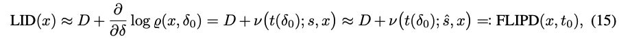 (14)를 푸는 것은 하나의 ODE solver에서 $\hat{s}$의 Jacobian의 trace를 여러 번 계산하는 것을 포함하고 이는 여전히 비싸다. 본 논문에서는 ODE solver에 대한 필요를 우회하는 LDI estimator FLIPD를 제안한다. LIDL은 (8)을 기반으로 하는데, 이 방정식을 미분하는 것은 negative enough $\delta_0$에 대해서 $\partial / \partial \delta \ \text{log} \varrho(x,\delta_0) \approx LID(x) - D$를 생성한다. 이는 (13)가 LIDL에서 regression이 추정하려고 하는 변화의 비율을 직접적으로 제공한다는 것을 의미한다.