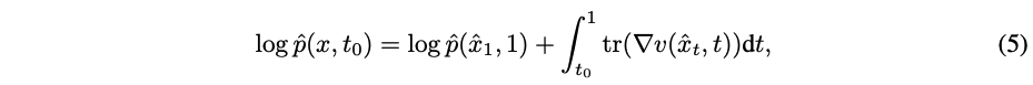$t_0$에서 1까지 이 ODE를 푸는 것은 trajectory $(\hat{x}_t)_{t \in [t_0,1]}$를 생성하고 이는 continuous change-of-variable formula를 통해 density evaluation에 사용된다.