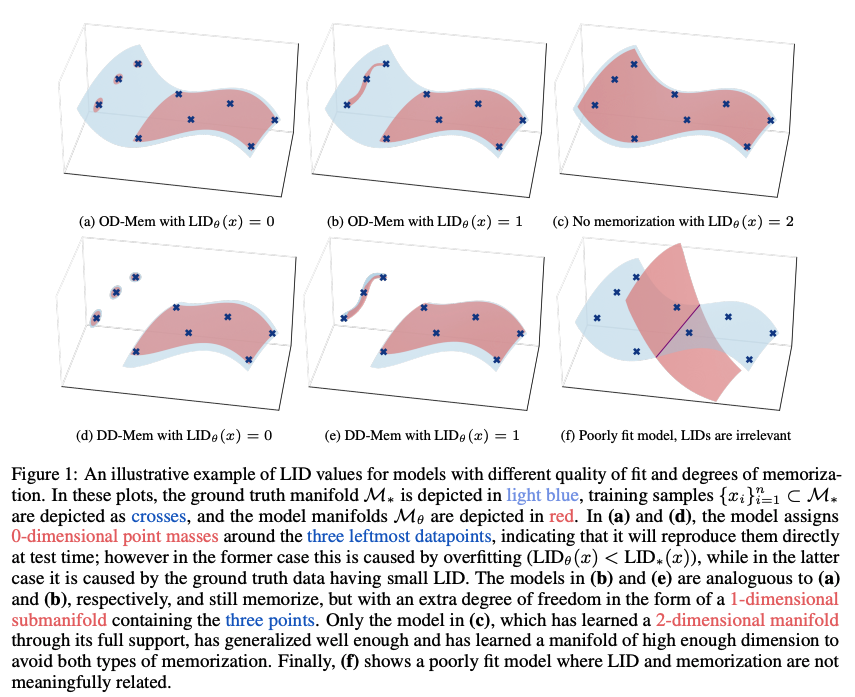 Figure 1(a)는 model $p_\theta(x)$가 정확히 몇 training data를 memorize해 이러한 training datapoint가 정확히 reproduce된다. 이를 달성하기 위해서, model은 이러한 datapoint들 주변의 0-dimensional manifold를 학습했다. 이 예시로부터, 본 논문은 $LID_\theta(x) = 0$일 때 $x$가 정확히 reproduce된다고 추론한다.