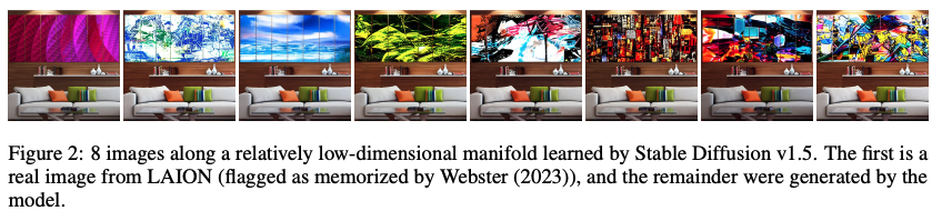 위의 예시와 같이 정확히 똑같은 이미지를 reproduce하지는 않지만 training 이미지의 특징들을 memorize하는 경우도 있다. 이러한 경우를 reconstructive memory, template verbatims라고 한다. 이러한 지점들의 $x \in \mathcal{M}_\theta$의 구역에서, model은 몇몇 특징에 대해서는 자유도를 가지고 이미지를 생성할 수 있지만, 몇몇 특징들에서는 매우 constrained된다. 기하학적으로 $\mathcal{M}_\theta$는 이상적인 ground truth manifold $\mathcal{M}_*$에 비교해서 매우 제한된다. ($LID_\theta(x) < LID_*(x)$) Figure 1(b)가 이러한 경우를 나타낸다.