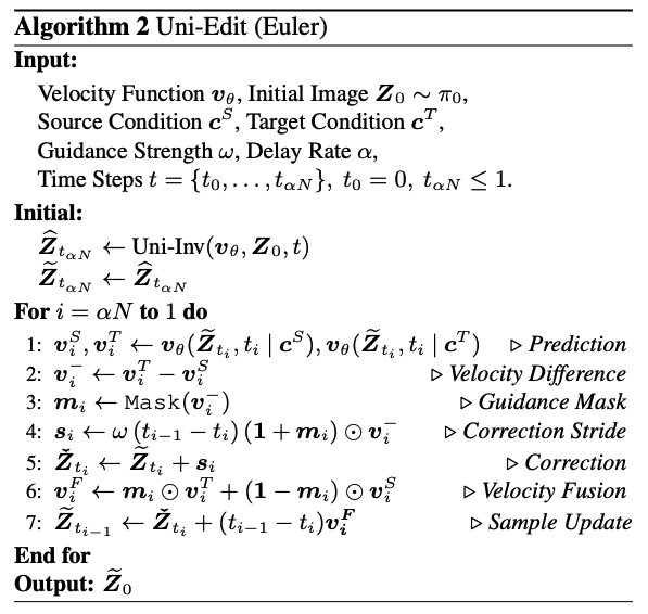 Diffusion model을 위해 디자인된 inversion과 editing method들은 flow model들에 대해서는 비효율적이거나 적용할 수 없다. 그래서 본 논문에서는 flow model들에서 inversion과 editing을 위한 predictor-corrector-based framework을 도입한다. 본 논문은 정확한 reconstruction을 위한 효과적인 inversion method인 Uni-Inv를 제안한다. 그리고 region-aware이고 robust한 image editing method인 Uni-Edit을 도입한다.