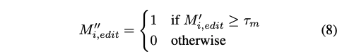 마지막 단계로, thresholding amsk $M^{\prime\prime}_{i,edit}$을 위해서 $\tau_m$을 가지고 thresholding operation을 수행한다.