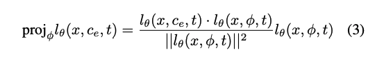 Attention output에 대한 projection이 주어지면, $l_\theta(x,\phi,t)$에 대한 $l_\theta(x,c_e,t)$의 orthogonal component를 다음과 같이 나타낸다.