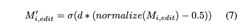 Mask $M_{i, edit}$이 주어지면, 본 논문은 boundary coefficient $d=10$과 sigmoid operator $\sigma$, min-max normalization operator $normalize$로 soft decision boundary $M^\prime_{i,edit}$을 도입한다.