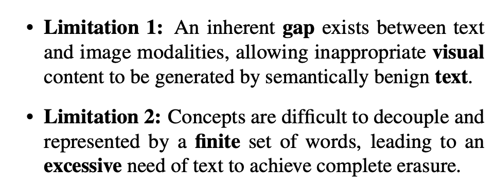 기존 concept erasure 방식들은 text에 집중했다. 하지만 본 논문에서는 text와 image 사이의 modality gap 때문에 text만 이용하는 것은 부족하다고 지적한다. 그래서 본 논문은 이 문제를 해결하기 위해서 text와 image를 모두 이용해서 concept erasure하는 framework을 제안한다.
