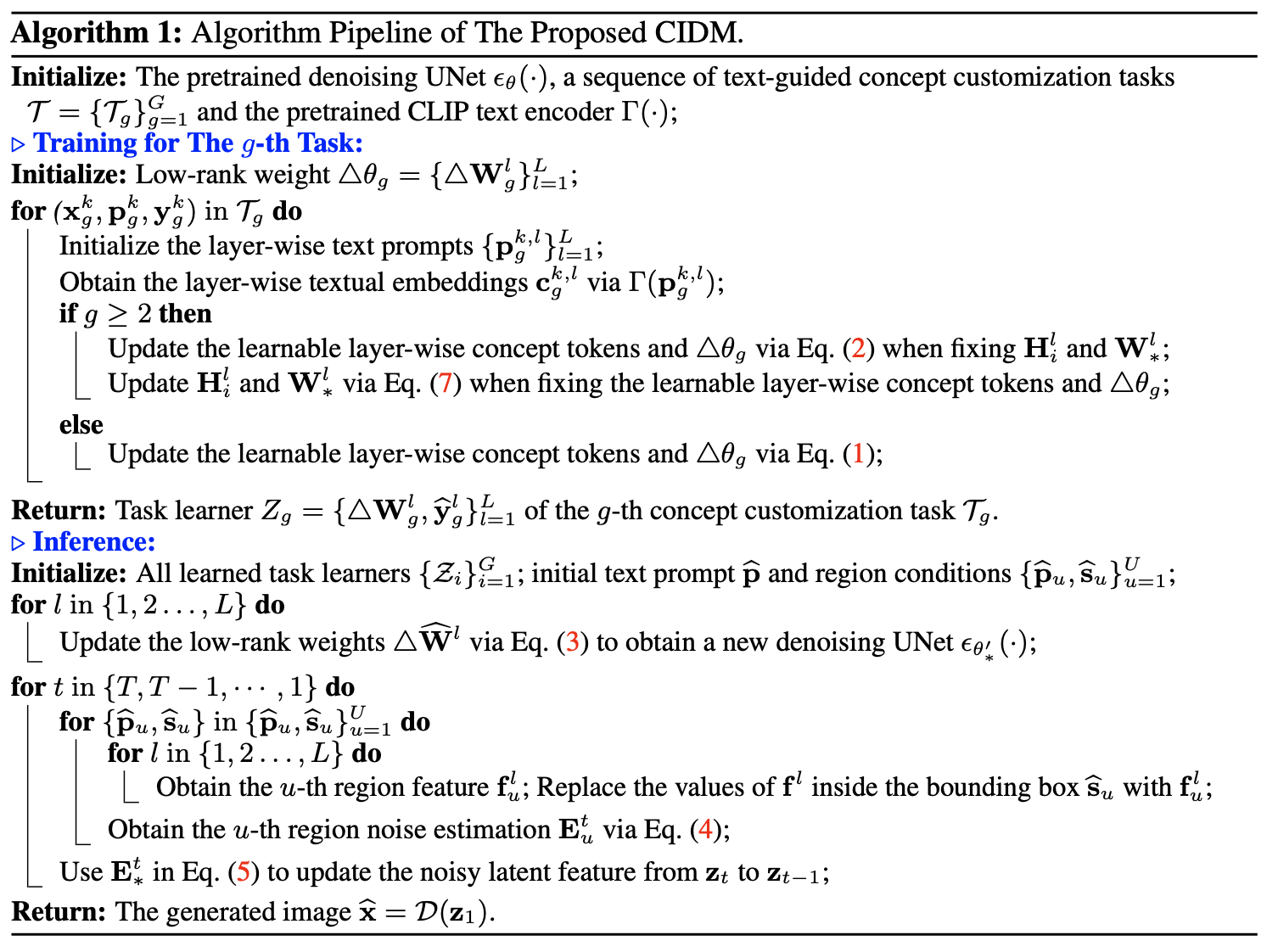 먼저 task-specific information을 캡쳐하기 위해, (2)를 이용해서 $\mathbf{H}^l_i$와 $\mathbf{W}^l_*$를 고정하고 learable layer-wise concept token들과 low-rank weight $\triangle \theta_g = \{ \mathbf{W}^l_g \}^L_{l=1}$를 update한다. 그러고 나서, task-shared knowledge를 찾기 위해, $\triangle \theta_g$와 learnable layer-wise concept token들을 고정하고 (2)에서 $\mathcal{R}_2$를 통해서 $\mathbf{H}^l_i$와 $\mathbf{W}^l_*$를 update한다. $g$번째 concept customization task를 학습하고 나서, 본 논문은 task learner $\mathcal{Z}_g = \{ \triangle \mathbf{W}^l_g, \mathbf{\hat{y}}^l_g \}^L_{l=1}$를 얻는다.