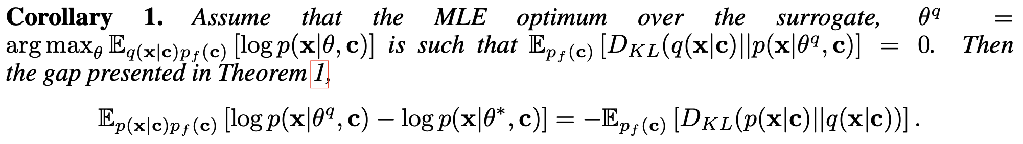 Theorem 1은 surrogate objective $\arg \max_\theta \mathbb{E}_{q(\mathbf{x}\vert\mathbf{c})p_f(\mathbf{c})}[\log p (\mathbf{x} \vert \theta, \mathbf{c})]$를 optimize하는 것은 original starting point $\theta^*$로부터 $\mathbb{E}_{p(\mathbf{x} \vert \mathbf{c})p_f(\mathbf{c})}[\log p(\mathbf{x} \vert \theta, \mathbf{c})]$를 줄이는 것을 보장한다.