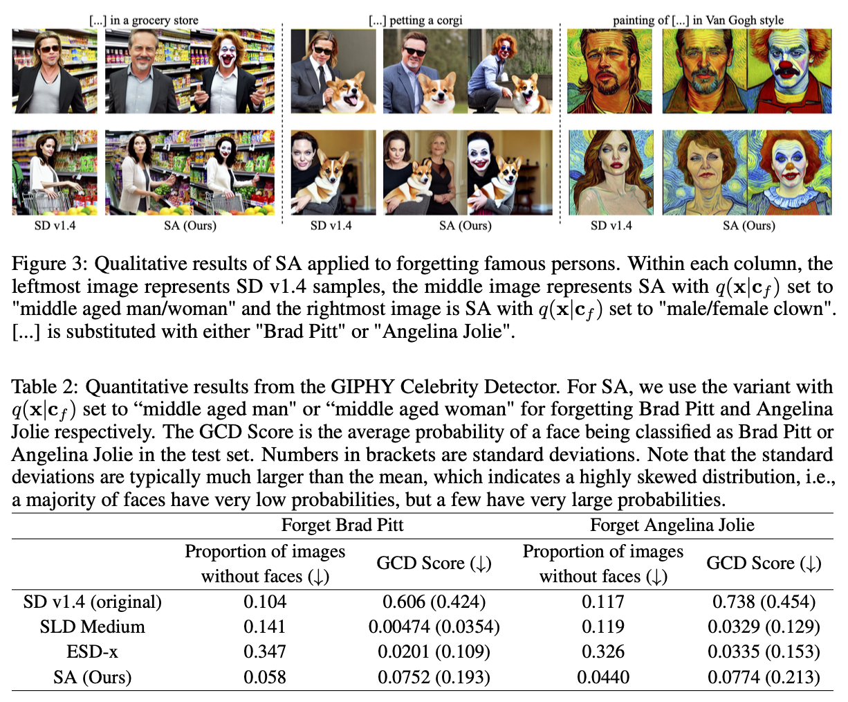 SD를 이용한 실험에서 "Brad Pitt"나 "Angelina Jolie"를 지우고 싶을 때, "a middle aged man"이나 "a middle aged woman"와 같은 prompt로 생성한 이미지들로 $q(\mathbf{x} \vert \mathbf{c}_f)$를 나타낸다.