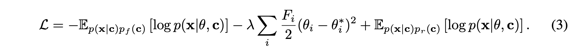 여기서 $\log p(D_f \vert \theta) = \log p(\mathbf{x}_f, \mathbf{c}_f \vert \theta) = \log p(\mathbf{x}_f \vert \theta, \mathbf{c}_f) + \log p(\mathbf{c}_f)$이고, $\log p(\theta \vert D_f, D_r)$은 EWC의 Laplace approximation으로 대체한다. 본 논문의 목표는 maximum a pasteriori estimate을 얻기 위해서 $\log p(\theta \vert D_r)$를 최대화하는 것이다. 직관적으로, (1)을 최대화하는 것은 $\theta$를 $\theta^*$와 가깝게 유지하면서 likelihood $\log p(\mathbf{x}_f \vert \theta, \mathbf{c}_f)$를 낮추는 것이다.