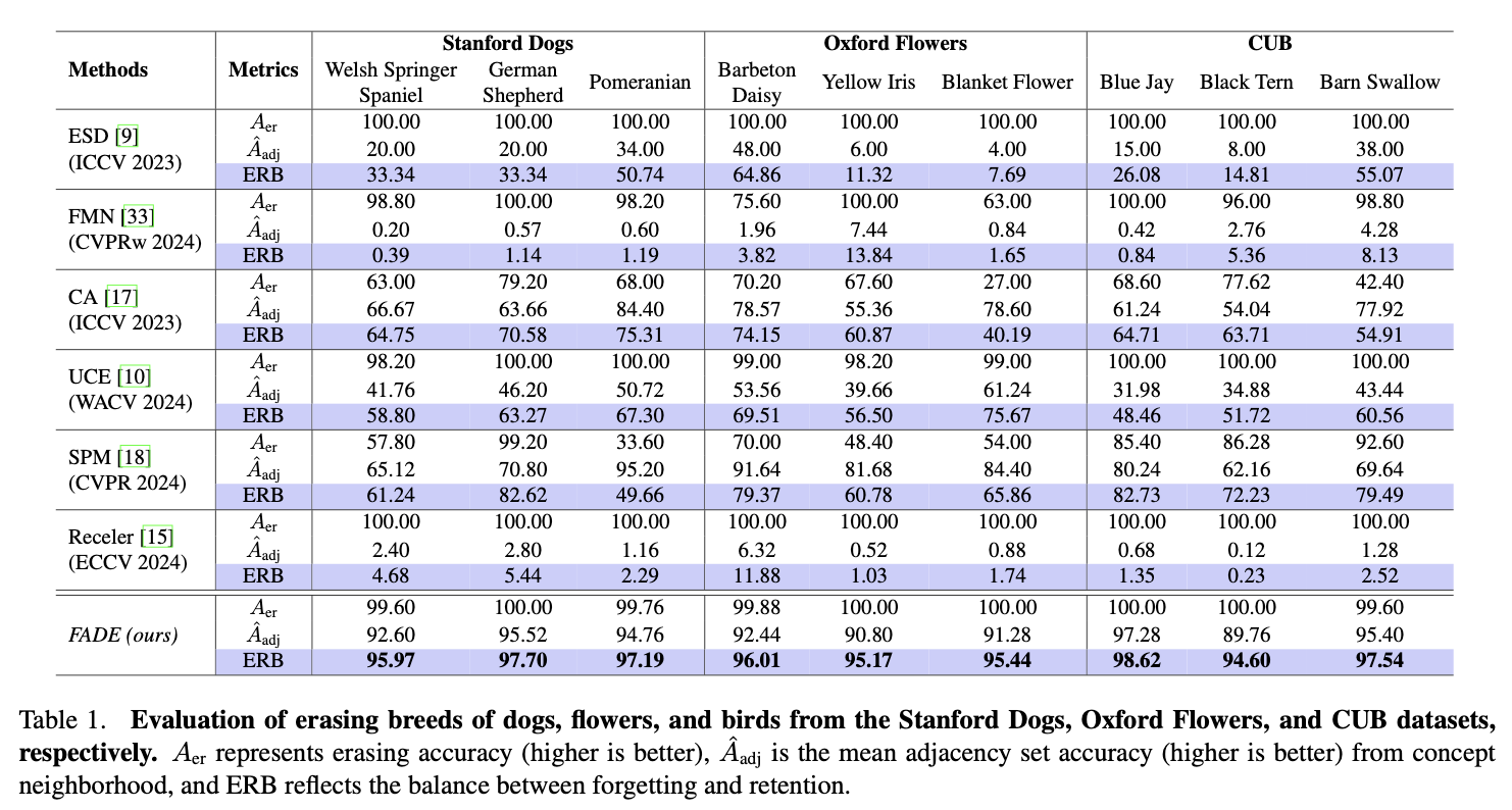 기존 concept erasure method들은 target concept과 연관이 있는 concept들에도 영향을 끼치는 문제를 가진다. 본 논문에서는 FADE(Fine-grained Attenuation for Diffusion Erasure)을 제안해 이 문제를 해결하려 한다. FADE는 Concept Neighborhood와 Mesh Modules로 구성된다.