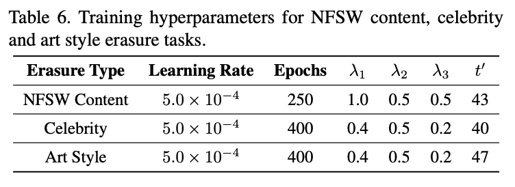 위 이미지에서와 같이, $t^\prime$에 적절하게 설정이 되면, 특정 틱징이나 디테일들이 제거되고 생성된 이미지의 naturalness는 보존된다. 이는 denoising의 early stage동안, 샘플들이 correct score function을 따르고 그럴듯한 data manifold로 가이드되기 때문이다. Later stage에서, guidance는 그 manifold안에 특정 mode로부터 떨어진 sample로 향한다. $t^\prime$이 너무 이르면 이미지의 구조적인 integrity를 잃고, 너무 늦으면 이미 concept-specific model에 들어갔기 때문에 fine detail들에만 영향을 준다.