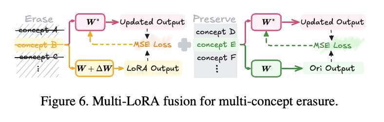 본 논문의 trajectory-aware loss function은 기존의 multi-concept erasure framework인 MACE에 통합될 수 있다. MACE에서 특정 concept을 지우기 위해서 weight를 closed form으로 구해서 그 weight로 기존 weight를 대체하는데, 이 stage는 생략하고 각 concept에 대한 LoRA를 finetuning하기 위한 MACE의 attention loss를 본 논문의 trajectory-aware loss로 대체한다. 이는 기존 MACE에서 Grounded-SAM모델을 필요로 하는 것을 없앤다. 각 concept들에 대해서 LoRA들을 학습하고 나서, 본 논문은 아래의 objective function을 사용해 cross-attention layer로 이들을 융합해 넣는다.
