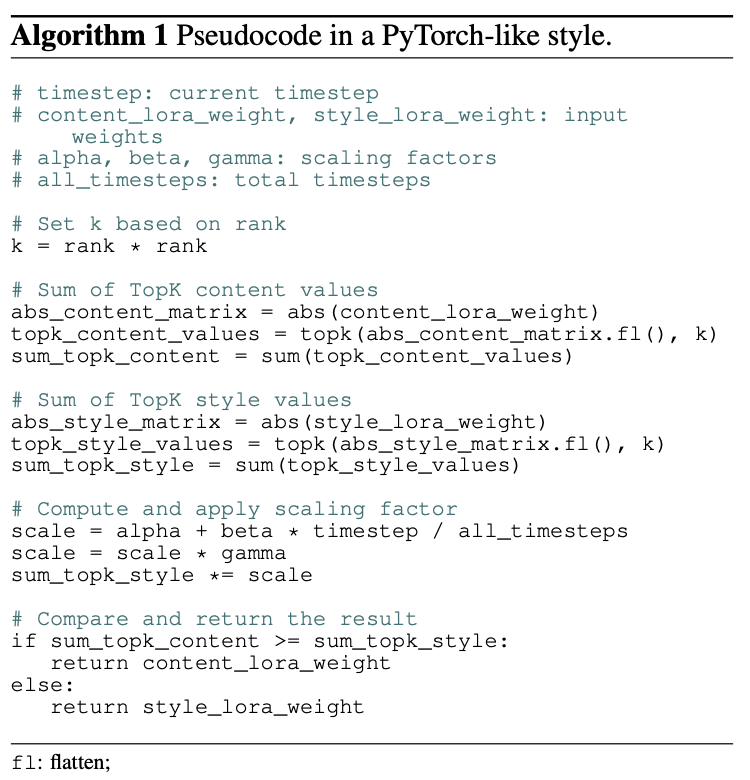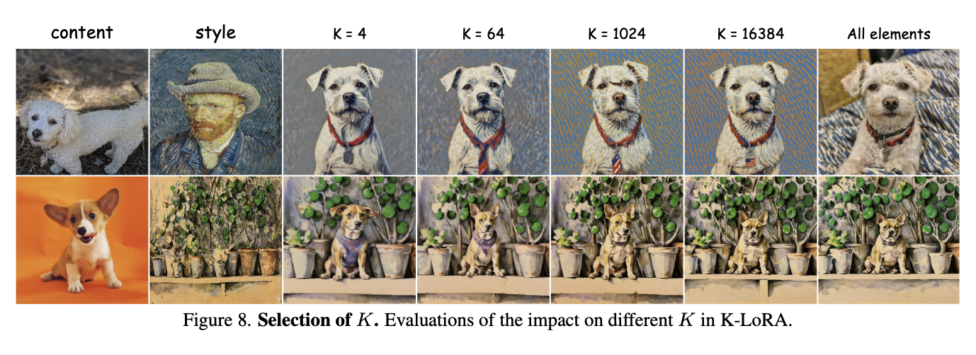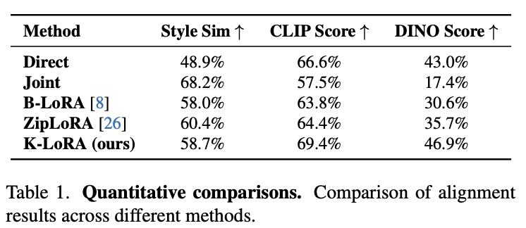 다른 LoRA들을 조합하는 기존 연구들은 원래 object나 style을 보존하지 못하거나 추가적인 training을 필요로 한다. 이 문제를 해결하기 위해서 본 논문은 training-free LoRA fusion appoach인 K-LoRA를 제안한다.
