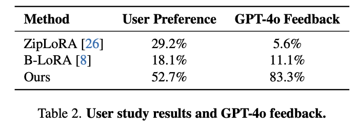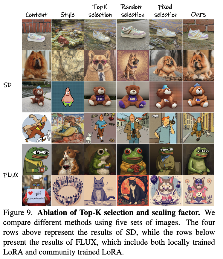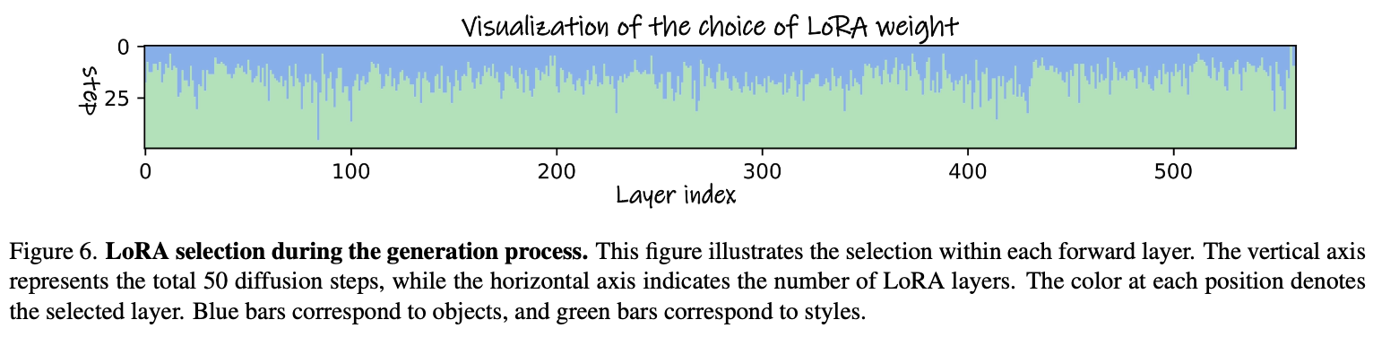 - Earlier diffusion step에 subject LoRA를 적용하는 것은 subject information을 잘 생성하는 경향을 보이고, later step에서 style LoRA를 적용하는 것은 content의 구성에 영향을 주지 않고 style과 detail들을 생성하는데 더 효과적인 것을 보인다.