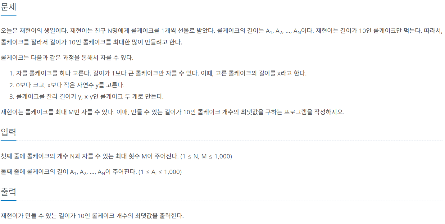 - 케이크 길이가 10이 넘으면 10으로 자르고 10인 케이크 개수를 1개 늘린다. -> 케이크 길이가 10보다 작거나 같아질 때까지 반복