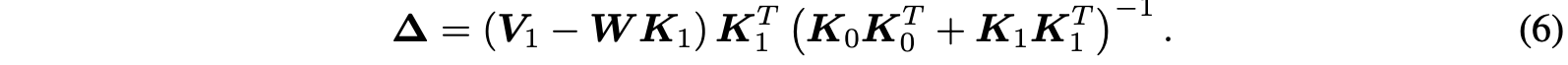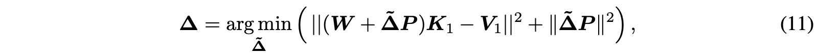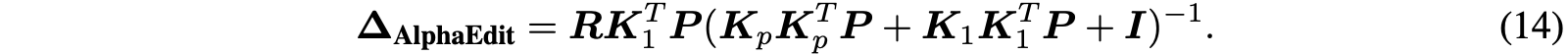 (13)을 풂으로써 최종 perturbation $\boldsymbol{\Delta}_{\mathbf{AlphaEdit}} = \boldsymbol{\Delta}\mathbf{P}$을 얻고 이는 model parameters $\mathbf{W}$에 더해진다.