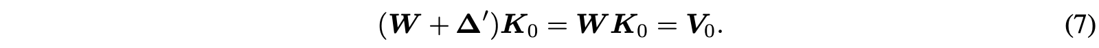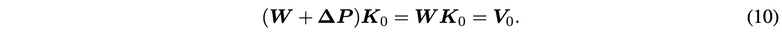이는 결국 projected $\boldsymbol{\Delta}$가 preserved knowledge $\{ \mathbf{K}_0, \mathbf{V}_0 \}$의 Key-value association을 손상시키지 않는다는 것을 의미한다. 그리고 이는 결국 preserved knowledge를 손상시키지 않는다는 것을 보장한다.