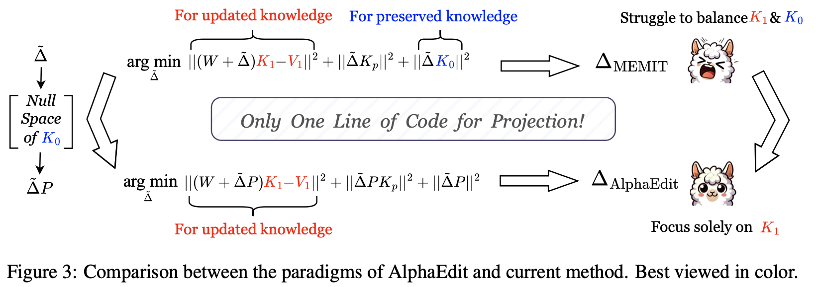 본 논문에서는 이 문제를 parameter-modifying 방식으로 해결하려고 한다. 기존의 parameter-modifying 방식은 knowledge-update error $e_1$와 knowledge-preservation error $e_0$사이의 밸런스를 유지하는데 어려움을 겪는다. 기존의 방식은 objective function에 $e_1$과 $e_0$를 둘 다 넣는다. 기존 방식들은 $e_1$을 줄이는데 집중하는데, 이는 updated knowledge에 대한 overfitting을 야기한다. 본 논문은 $e_1$만을 사용하고 새로운 objective의 solution을 preserved knowledge의 null space로 projection하는 방식인 AlphaEdit을 통해 이 문제를 해결한다.