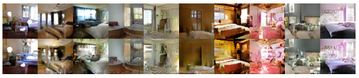 여러 이미지들에서 반복되는 noise texture들이 보이기 때문에 아직까지 under-fitting됐다는 증거라고 합니다. LSUN 데이터를 통해 모델이 memorization으로 이미지를 생성하는 것이 아니라는 것을 보여줬네요.
