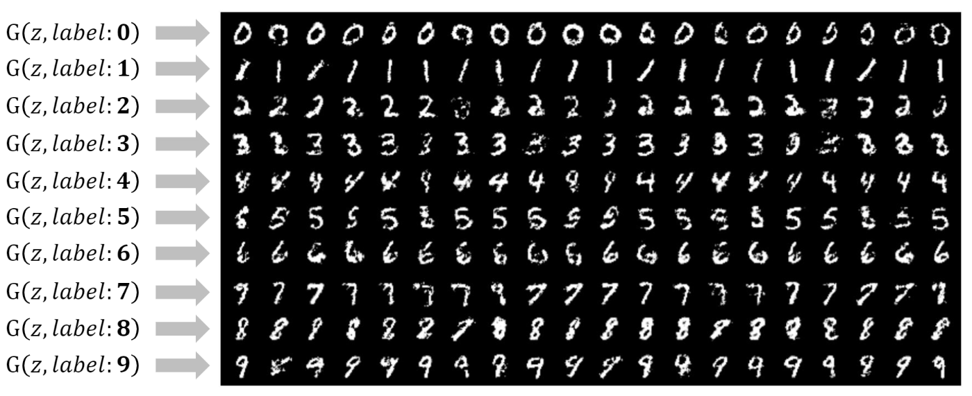 위 이미지에서 볼 수 있듯이 MNIST 데이터로 한 실험에서 label이란 조건이 주어지면 label에 맞는 이미지를 생성하는 것을 볼 수 있다.