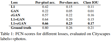 그리고 아래의 표는 여러가지의 loss를 통해 생성한 이미지들의 FCN score를 측정한 결과를 표로 나타낸 것이다. L1 + cGAN의 경우가 점수가 제일 높은 것을 볼 수 있다. 게다가 GAN 과 cGAN을 비교해보면 차이가 많이 나는 것을 볼 수 있는데, 그 이유로는 GAN은 Input 이미지와 output 이미지의 mismatch 에대해 penalize 하기보단 realistic한 이미지를 다양하게 생성한다. 하지만 image to image translation에서는 이미지가 주어졌을 때 그에 맞게 이미지를 생성하는 것이 중요하기 때문에 GAN loss가 이러한 task에서는 적절하지 않은 것을 알 수가 있는 실험이다.