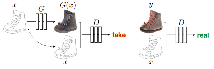 여기서 일반적인 GAN과 다르게 노이즈 z를 없애줬는데, 이 논문에서의 주 목적은 다양한 이미지를 생성하는 것이 아니고 조건 이미지인 x에 맞게 이미지를 생성하는 것이 주 목적이기 때문에 노이즈 z를 빼서 deterministic한 결과를 생성하게 했다.