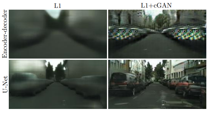 아래 이미지를 보면 endcoder-decoder를 이용할 때보다, U-Net을 이용할 때 생성된 이미지의 퀄리티가 좋은 것을 볼 수 있다. loss를 L1만 사용할 때, L1 + cGAN을 사용할 때 둘다 더 현실적으로 이미지를 생성한 것을 볼 수 있다.
