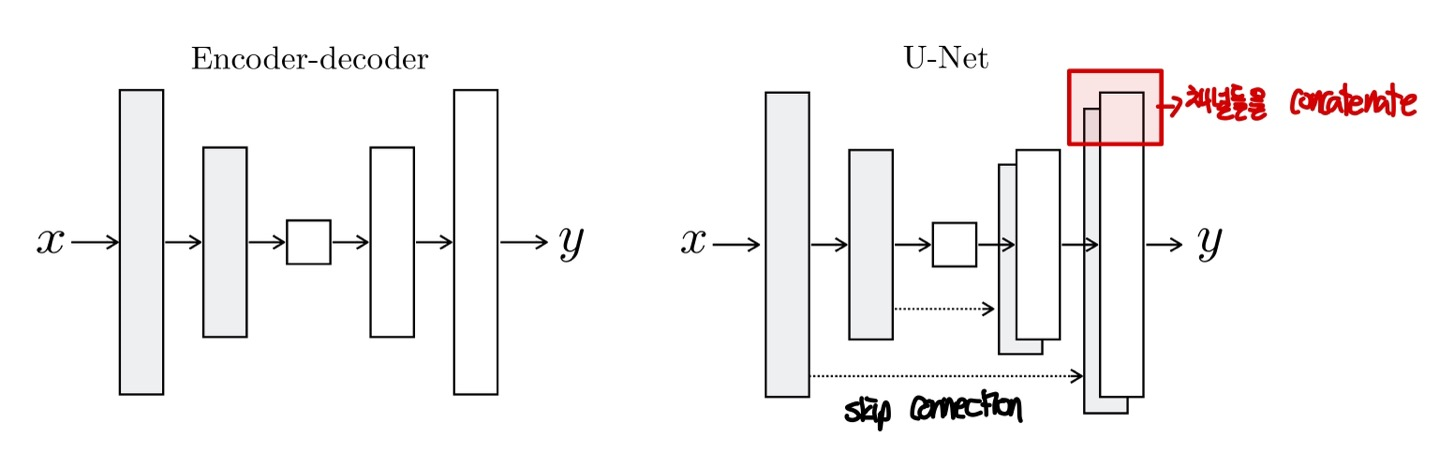 위 이미지를 보면 encoder-decoder와 u-net을 볼 수 있다. 여기서 두 네트위크의 차이는 바로 skip connection이다. Image to image translation을 잘 하기 위해서는 Input이 가지는 정보를 Output도 가져야한다. 그렇기 때문에 encoder-decoder에서 앞단이 추출한 정보(representation, feature)들을 뒷단으로 넘겨주는 skip connection을 넣으면 성능이 더 좋아진다. 그렇기 때문에 skip connection을 가진 U-Net의 구조를 Generator에 사용한다고 한다.