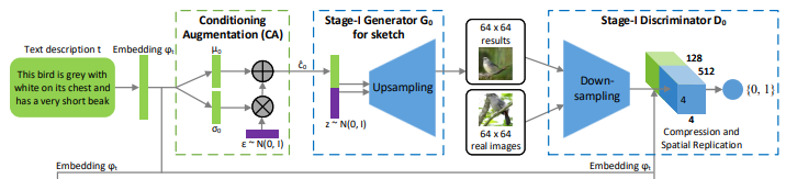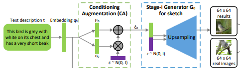 일단 Stage-I GAN 의 역할을 그림 그리는 것에 비유하면 sketch를 하는 과정이라고 비유할 수 있다. 정확히 설명하면, text에 따라 물체의 대강의 형태와 기초 색을 그리고, random noise vector로부터 배경 레이아웃을 그리는 역할을 한다. low resolution 이미지가 output으로 나온다. CA 과정에서 생성된 cˆ0와 random variable z를 통해 Generator G0와 Discriminator D0를 학습시킨다.