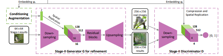 Stage-I과 거의 유사하지만 input으로 들어오는 이미지 사이즈가 커졌다는 점이 다르다. 그리고 image와 text사이의 alignment를 잘 학습시키기 위해 기존 vanilla-GAN의 discriminator가 아닌 matching-aware discriminator를 사용했다.
