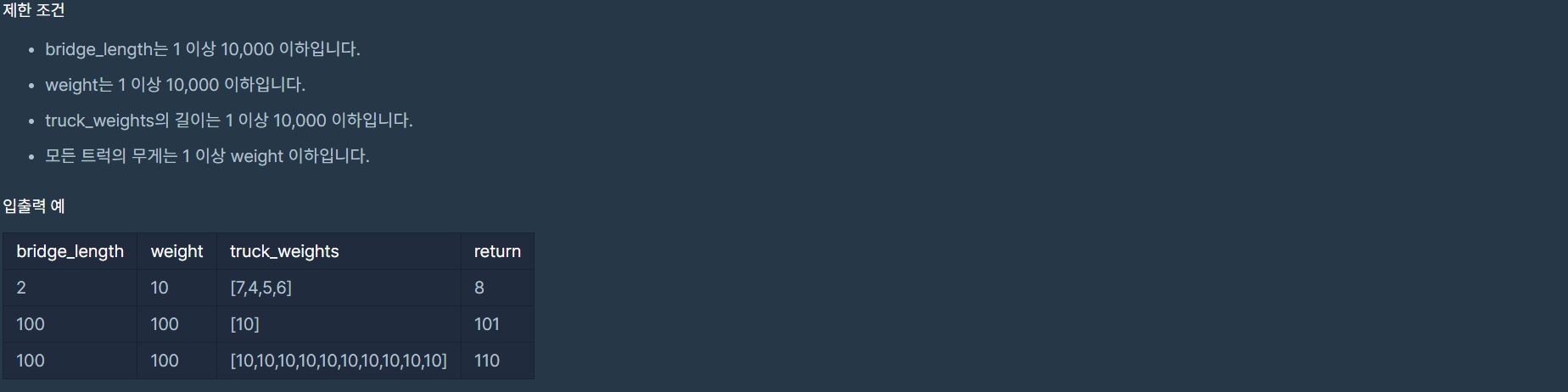 - bridge위의 무게가 weight보다 작으면 bridge에 truck_weights.pop(0)를 append