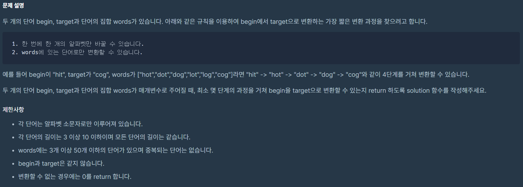 큐에 넣을 때, 몇번 걸쳐서 그 단어에 도달했는지를 나타내는 cnt 값도 같이 넣어주는 방식으로 진행을 해야 내가 한 틀린 방식을 해결할 수 있는 것 같다. 그러고 특정 단어에서 1개의 알파벳만 다른 단어를 찾고 그 단어를 큐에 넣어준다. 이런 방식을 q에 아무것도 없을 때까지 while문을 반복하고 target이 나오면 그때의 cnt값이 정답이고 정답이 안나오면 target에 도달할 수 없다는 것이기에 0을 return하도록 한다.