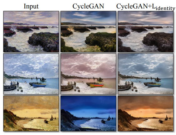 왼쪽 이미지들의 결과를 통해 CycleGAN은 '별이 빛나는 밤에'의 그림 스타일을 모방하는 것이 아니라 반 고흐 작품들의 전체적인 스타일 모방하는 것을 확인할 수 있다. 또한 오른쪽의 결과를 통해 identity loss를 통해 생성된 이미지가 원래 이미지의 색상을 보존하는 것을 확인할 수 있다. 이 때 identity loss는 $\mathcal{L}_{identity}(G,F) = \mathbb{E}_{y \sim p_{data}(y)}[\Vert G(y)-y\Vert_1] + \mathbb{E}_{x \sim p_{data}(x)}[\Vert F(x) - x\Vert_1]$로 표현할 수 있다.