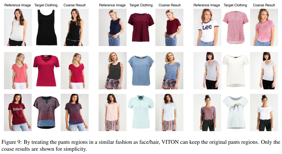 또한 바지의 경우 제품 이미지가 제공되지 않은 채로 모델에 의해 생성됩니다. 이는 모델이 서로 다른 패션 아이템 간의 동시 발생을 암묵적으로 학습하고 있음을 나타냅니다. 바지 영역을 얼굴 및 머리카락과 유사한 방식으로 처리하면 VITON은 원래의 바지를 유지할 수 있다.