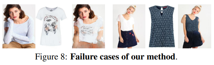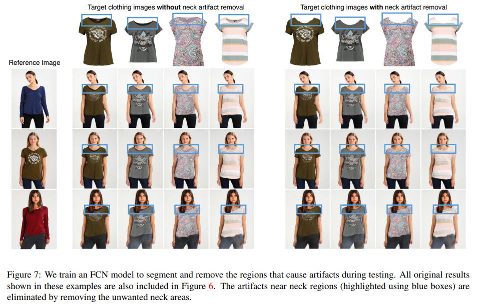 그러나 마지막 행의 목선 주변에는 약간의 artifacts가 있는데, 이러한 artifacts는 의상 이미지에서 neck tag 와 inner collars에 의해 발생한다. 이 artifacts를 없애기 위해 FCN model을 학습시켜서 의류 이미지를 warping시키 전에 의상 이미지의 neck tag와 inner collars를 제거하고 그 이미지를 이용해서 해결한다.