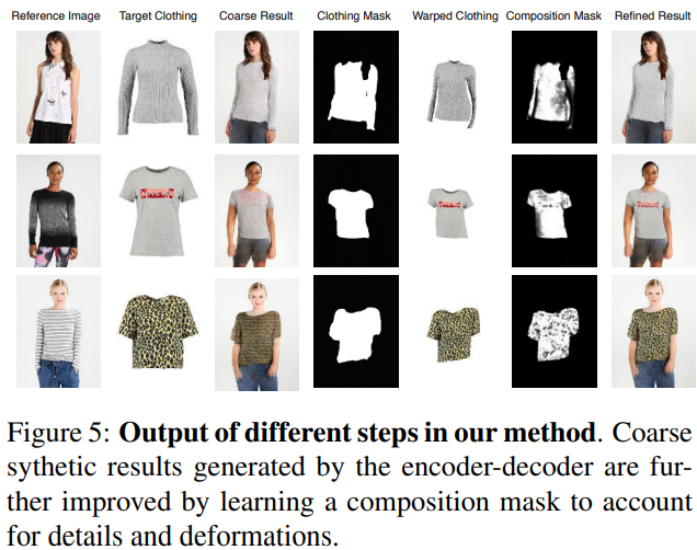 그림 5는 단계별 생성된 결과를 시각화한 것이다. Encoder-decoder는 대상 의류 아이템과 사람의 모습이 주어지면 대상 의류 아이템의 그래픽이나 텍스처와 같은 디테일이 누락된 채 인물의 포즈, 체형, 얼굴이 보존된 거친 결과물을 생성한다. Clothing mask를 기반으로 refinement 단계에서는 대상 의류 이미지를 왜곡하고 composition mask를 예측하여 coarse systhesis 이미지에서 어떤 영역을 대체해야 하는지 결정한다. 결과적으로 대상 의류 이미지에서 "copied"된 중요한 디테일은 인물의 해당 의류 영역에 "pasted"됩니다.