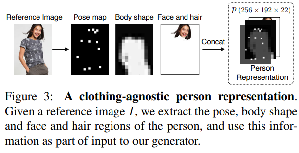 마지막으로, 이 세 가지 특징 맵의 크기를 동일한 해상도로 조정한 다음 concatenate하여 clothing-agnostic person representation $p$를 형성한다.($p \in R^{m * n * k}$ , m = 256 및 n = 192는 특징 맵의 높이와 너비를 나타내고 k = 18 + 1 + 3 = 22는 채널 수를 나타냄). 이 representation에는 관계를 모델링하기 위해 컨볼루션이 수행되는 사람에 대한 풍부한 정보가 포함되어 있어서 이전 작업보다 더 상세하다고 한다.