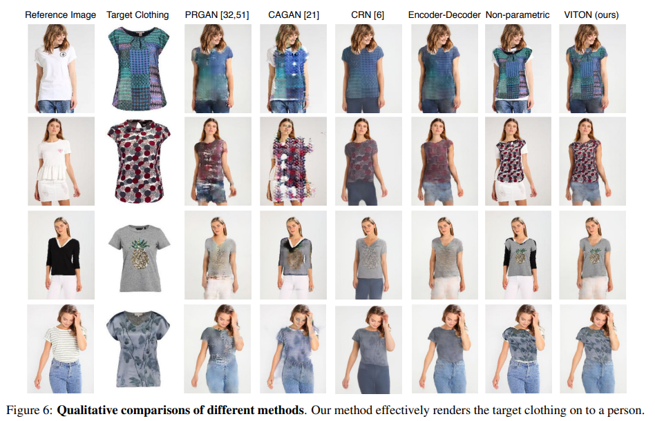그림 6은 서로 다른 방법의 시각적 비교를 보여줍니다. CRN과 Encoder-decoder는 대상 의류 아이템의 디테일을 렌더링하는 위치와 방법을 모르기 때문에 흐릿하고 거친 결과를 생성한다. Adversarial training을 사용하는 방법은 shaper edge를 생성하지만 원하지 않는 artifacts를 생성하기도 한다. Non-parametric baseline은 원본과 타깃 의류 아이템 간의 불일치에 관계없이 왜곡된 타깃 이미지를 인물에 직접 붙여넣기 때문에 부자연스러운 이미지가 생성된다. 이러한 방식과 달리 VITON은 정확하고 매끄럽게 상세한 가상 착장 결과를 생성한다.
