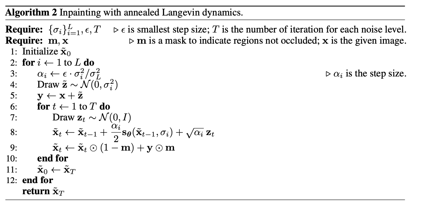 그림 6에서는 score network가 일반화 가능하고 의미론적으로 의미 있는 이미지 표현을 학습하여 다양한 이미지 인페인팅을 생성할 수 있음을 보여준다. annealed Langevin dynamics 절차를 아래의 알고리즘에 보이듯이 간단하게 수정하여 임의의 형태의 occlusions이 있는 이미지를 자연스럽게 처리할 수 있다고 한다.
