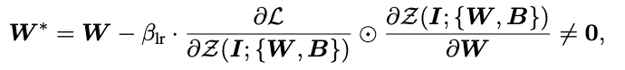 여기서 $W, B$의 gradient가 0이 아니게 된다. 이렇게 되면 아래의 수식처럼 $W$가 update가 된다.