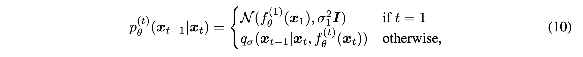 Fixed prior $p_{\theta}(x_t) = \mathcal{N}(0,I)$를 가지고 아래과 같이 generative process를 정의할 수 있다.