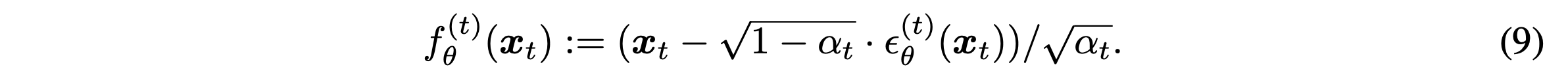 $x_0 \sim q(x_0)$과 $\epsilon_t \sim \mathcal{N}(0,I)$에 대해 식 (4)를 통해 $x_t$를 구할 수 있다. Model $\epsilon_{\theta}^{(t)}(x_t)$은 $x_t$를 통해 $\epsilon_t$를 예측한다. 이를 이용해 식 (4)를 다시 써서 나타내보면 아래와 같이 $x_0$에 대한 prediction을 얻을 수 있다.