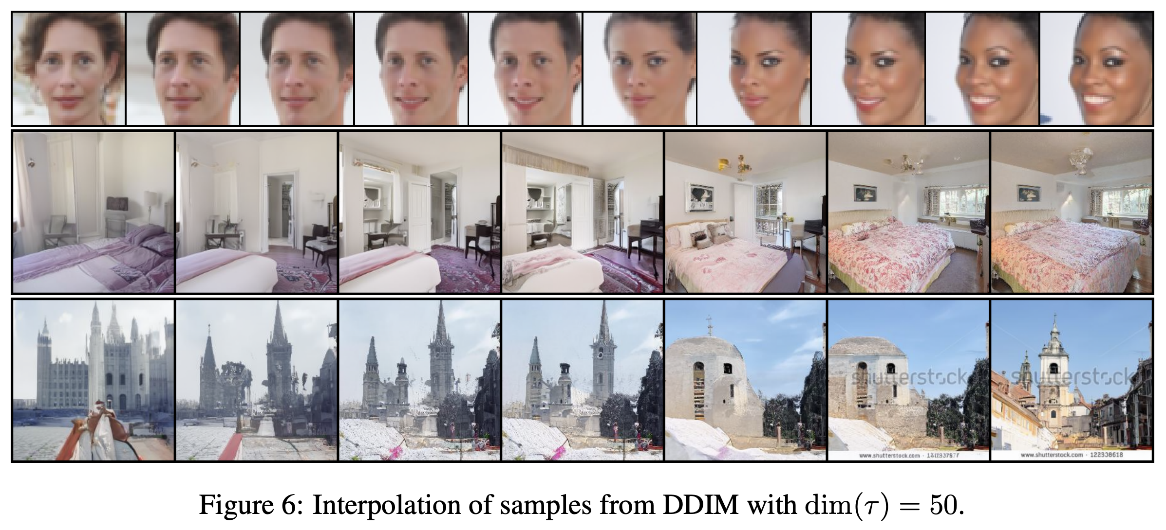 DDIM에서 generative process는 deterministic하고 $x_0$는 initial state인 $x_T$에만 의존한다. 위 이미지에서 보면 다른 generative trajectory (다른 $\tau$)에 대해 같은 initial state $x_T$에서 이미지를 생성하면, high level feature가 동일한 이미지가 생성된 것을 볼 수 있다. 20step을 통해 생성된 이미지는 1000 step을 통해 생성된 이미지와 거의 유사하다. 이러한 사실을 통해 $x_T$는 이미지의 informative latent encoding이라고 할 수 있다.
