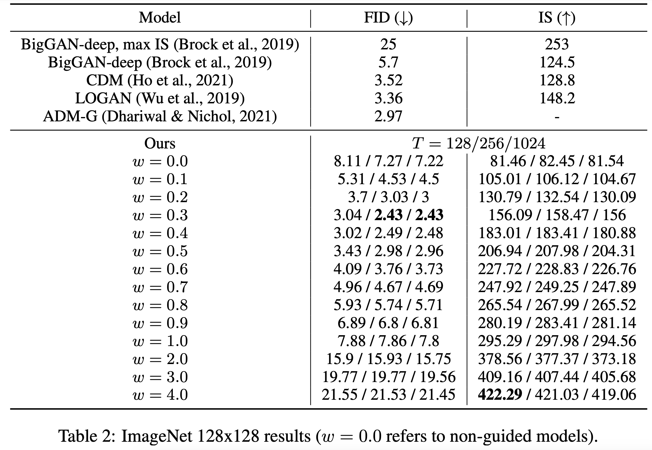 Classifier-free guidance가 classifier guidance나 GAN truncation과 유사한 방식으로 IS와 FID를 trade off할 수 있다는 것을 보인다. 아래의 결과는 64*64와 128*128 ImageNet 모델에 대한 guidance strength $w$를 바꾸면서 실험한 결과이다.