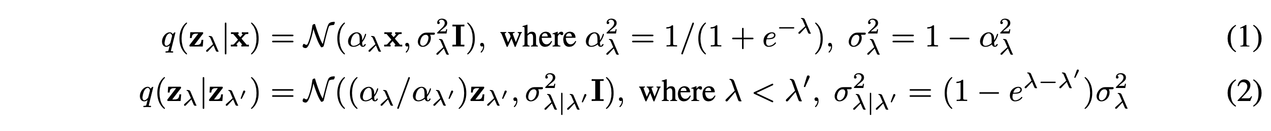 본 논문에서 $x \sim p(x)$이고 $z \sim q(z|x)$일 때, $z(z_\lambda)$의 marginal을 $p(z)(p(z_\lambda))$로 표기한다. $\lambda = {\rm log}\alpha^2_\lambda / \sigma^2_\lambda$이다. 그래서 $\lambda$는 $z_\lambda$의 log signal-to-noise ratio로 해석될 수 있다. 그리고 forward process는 $\lambda$가 줄어드는 방향으로 진행된다.