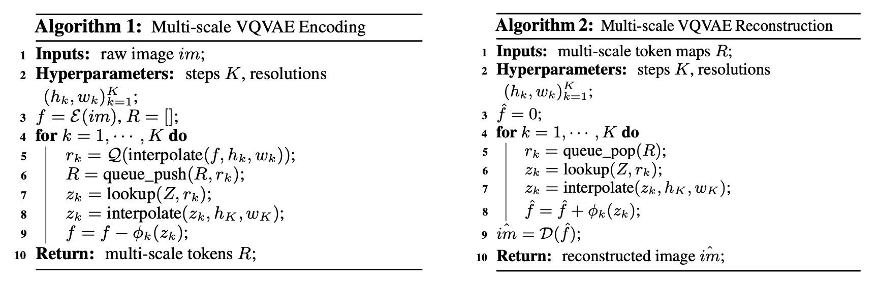 본 논문에서는 VAR을 학습시키기위한 이미지를 K multi-scale discrete token maps $R = (r_1,r_2,\cdots,r_K)$로 encode하는 새로운 multi scale quantization autoencoder를 개발한다. Encoding과 decoding 절차는 아래의 방식으로 이루어진다. 그리고 $z_k$를 $h_K \times w_K$로 upscaling을 할 때 정보 손실을 다루기위해, 본 논문에서는 K개의 extra convolution layers $\{ \phi_k \} ^K_{k=1}$를 사용한다.