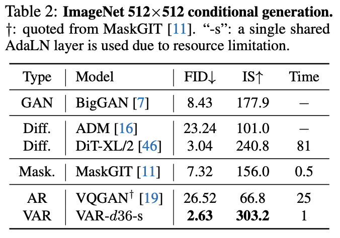 VAR은 가장 높은 FID/IS를 얻었을 뿐만 아니라 이미지 생성 시간도 놀랍다. 또한 precision과 recall도 좋게 나왔다.